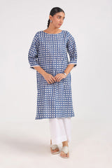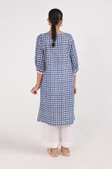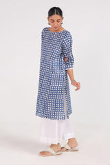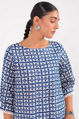 A classic-fit block printed shirt with a round neckline, finished with delicate lace detailing on the sleeve hems.