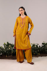 An embroidered paneled kurta featuring a round neckline with a V-slit, adorned with dori piping. The kurta showcases delicate embroidery with sequin accents, mirrored on the panels and sleeve hems. Paired with a farshi shalwar, finished with fine stitching on the ankle hemline.