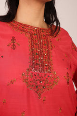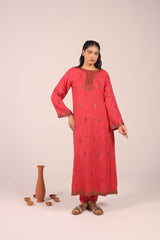 An embroidered shirt featuring a round neckline adorned with delicate embroidery and sequin work. Embroidered motifs are scattered across the shirt, while the shirt and sleeve hems echo the same detailing for a cohesive finish. Paired with a solid pegged shalwar.