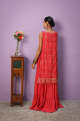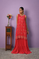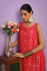 An A-line paneled shirt featuring criss-cross thread-embroidered floral bail detailing along the neckline. The shirt is further enriched with embroidered motifs scattered across the front and sleeves. Designed with a comfortable inner lining for ease and wearability, it is paired with  churidar pajama, completing a look that is both classic and refined.