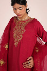 An embroidered straight-fit kurta with a round neckline, richly adorned with intricate golden tilla work on a speckled base. The shirt border echoes the same embroidered detail, complemented by a delicate motif at the back. Paired with solid culottes finished with printed trims, and a dupatta featuring scattered embroidered motifs and finely detailed borders, completing the timeless ensemble.