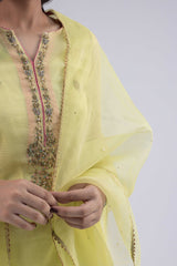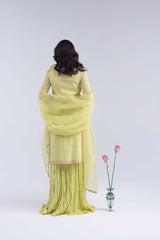An embroidered shirt with a round neckline and v-slit, adorned with delicate naqshi, kora dabka, sequins, beads, and sequin work, with scattered motifs adding texture throughout. The design is elevated by a scalloped hemline with fine embroidery. Paired with a crushed sharara for a festive flair and an organza dupatta embellished with gota lace and a soft sequin spray. Includes an inner for added comfort and ease.