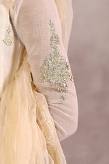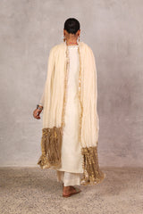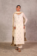 An exquisitely embroidered panelled kurta with a V-neckline, featuring intricate adda work and delicate sequin accents. Scattered motifs adorn the kurta, with detailed embroidery on sleeve hems. Comes with a dupatta trimmed in golden borders and kiran detailing, a comfortable inner lining. Paired with straight-fit trousers for a timeless, elegant look.
