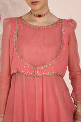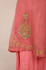 A formal flared frock with a round neckline, intricately adorned with golden embroidery and shimmering sequin accents. The puff sleeves feature delicate gold detailing and sequin work on the hemline. The embroidered koti, finished with tassels, enhances the elegance, complemented by crushed trousers and a matching dupatta, also adorned with tassels, for a sophisticated look.
