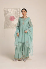 An embroidered kurta with a round neckline and V-slit, adorned with delicate embroidery and sequin work. The sleeves feature intricately detailed hems, while scattered embroidered motifs add a graceful touch. Paired with farshi shalwar featuring embroidery along the ankle hem. Comes with a soft inner for comfort and an organza dupatta adorned with chandbali motifs, gota edging, and tassels on the corners for a festive finish.