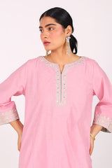 An embroidered formal, classic-fit paneled kurta featuring a round neckline with a V-slit, adorned with intricate tilla, panni, and resham threadwork. The sleeves mirror this delicate detailing, adding a refined touch. Paired with straight-fit trousers and a soft inner for added comfort. The look is completed with an organza dupatta featuring scalloped borders, scattered motifs, mirror work, and tassel detailing for a festive finish.