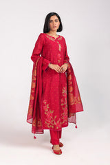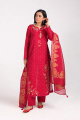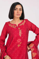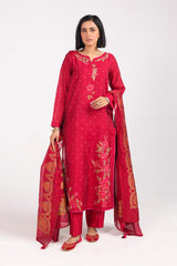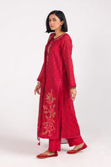 A jacquard embroidered shirt with a round neckline and V-slit, adorned with delicate embroidery and subtle sequin accents. Paired with straight-fit trousers and a soft inner for added comfort and ease. Style it with the jacquard dupatta, finished with tassel detailing, for a festive and elegant look.