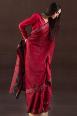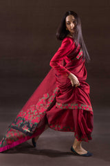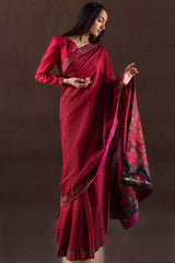 A formal jacquard saree paired with a delicately embroidered fitted blouse. Draped in a cotton-chanderi blend saree with golden thread accents, the saree is adorned with jacquard florals and lurex for a festive, radiant finish. Styled with a classic cotton-silk petticoat for graceful draping.