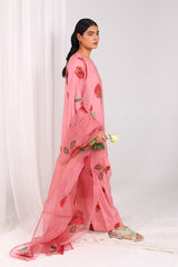 Fresh, feminine, and effortlessly elegant — this rosy pink printed ensemble brings floral charm to your everyday style. Featuring an all-over rose inspired print on a soft, breathable PK Rawsilk, the set includes a loose fit straight-cut shirt with round neckline, matching printed classic fit shalwar, and a matching printed organza dupatta. Whether you're dressing up for a casual get-together or a daytime celebration, this look strikes the perfect balance between comfort and style.
