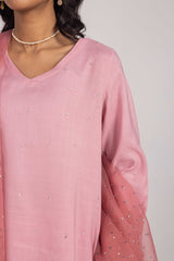 A loose-fit shirt featuring a V neckline, adorned with all-over stud embellishments on the front and sleeves. The ensemble is styled with cuffed peasant sleeves, finished with button detailing at the cuffs. Paired with a farshi shalwar and a printed organza dupatta enhanced with scattered studs for a modern, festive touch.