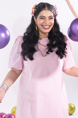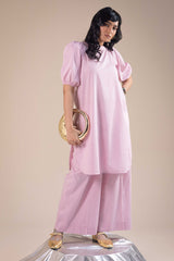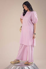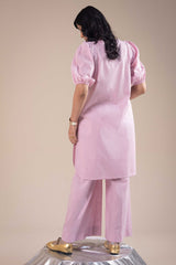 Classic-fit shirt with a shawl-collar neckline and half sleeves featuring exaggerated puff and cinched detailing. Rounded hem. Paired with matching culottes for a cohesive, stylish look.