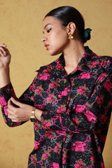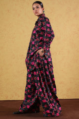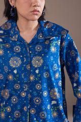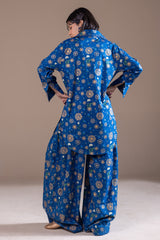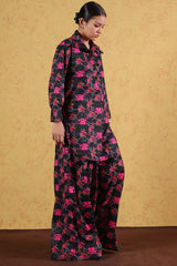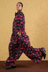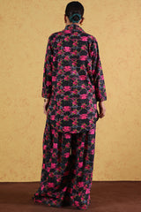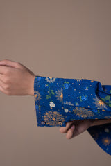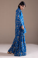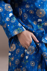 Printed classic-fit shirt featuring a collar neckline and cuffed sleeves, highlighted with a playful, contemporary print. Designed with a short rounded hem and paired with a matching farshi shalwar, finished with subtle stitching detail at the ankles.
