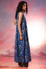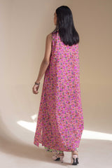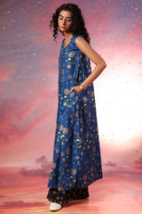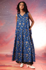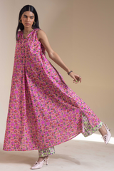 Gold-printed long flared shirt with a V-neckline featuring loop detailing and a front slit. Side pockets add both functionality and style. Paired with complementary gold-printed culottes for an iconic look.