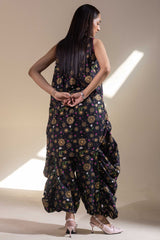 Luxurious gold-printed shirt with a V-neckline and loop design detail. Features a rounded hem and gathers at the back. Paired with matching printed jasmine shalwar with gathered ankle hems.