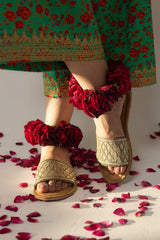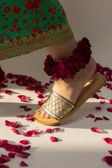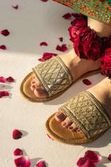 Step into elegance with this brown cow leather slide, adorned with golden mukesh and tilla work for a heritage touch. A beige leather lining ensures durability, while the padded tan insole with copper tilla stitch adds comfort. Finished with a sturdy leather sole, it’s a timeless blend of tradition and ease.