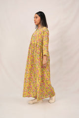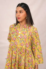 The serene grove of ruby fruit treasure – an A-line hand block printed dress featuring a band neckline with a graceful V-slit, enhanced with delicate button detailing. Featuring gathers at the waist and crochet lace detailing on the sleeve hems, this versatile dress is perfect for the summer days.