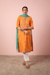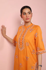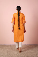 A classic-fit handcrafted kurta featuring a band neckline and buttoned front placket. It is adorned with colorful hand embroidery on the neckline, placket, sleeves, and hemline. Delicate embroidered motifs are scattered throughout the kurta, enhancing its charm. Can be styled with any bottoms for a complete look.
