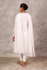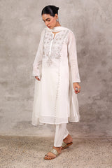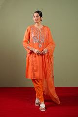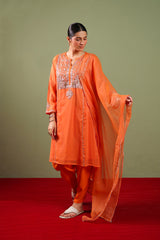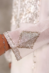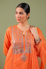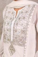 A classic-fit paneled hand-embroidered shirt with a round neckline and V-slit, detailed with delicate embroidery along the bodice, panels, and sleeve hems. Embroidered detailing at the back adds a subtle finishing touch. Paired with a classic-fit shalwar and a gota lace-trimmed dupatta for a refined, traditional look.