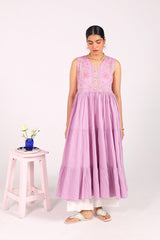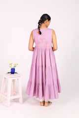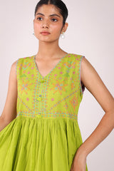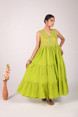A handcrafted tiered frock featuring a V-neckline, adorned with colorful hand embroidery and tassel detailing at the bodice. Structured borders and embroidered sleeve hems enhance the design, while soft gathers create a dancing flare. A Mughal bagh embroidered motif at the back adds charm. Can be paired with any generation bottoms.