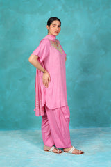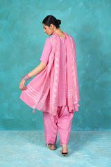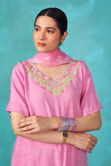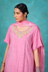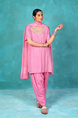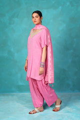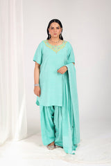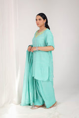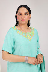 A loose fit shirt with round neckline, featuring intricate floral inspired embroidery detaling on rounded neckline all meticulously done by hand in a variety of french knots and running stitches with crochet lace detailing on sleeve hems. Paired with a solid farshi shalwar and a matching dupatta with denier borders and tassel detailing at dupatta corners.