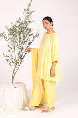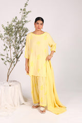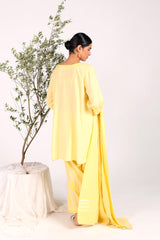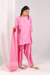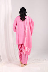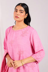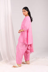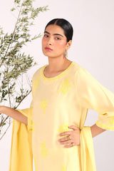 A hand-embroidered kurta with a round neckline, adorned with intricate embroidery enhanced by subtle sequin work. The sleeves feature festive phool-bahar motifs and delicate beadwork. Paired with a matching embroidered shalwar with detailed ankle hems, and a jacquard dupatta finished with tassels for an elegant touch.