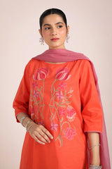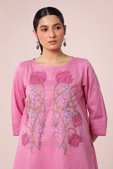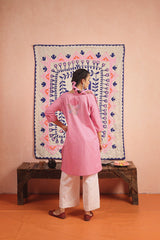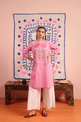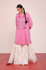 A classic-fit kurta features a round neckline and is brought to life with hand-embroidered feminine floral motifs on the bodice, highlighted by fine stitching details. The sleeve hems are adorned with subtle stitching, while a statement floral motif at the back adds an artistic touch. Pair it with any Generation lowers for a soft look.
