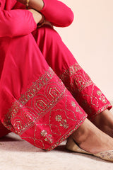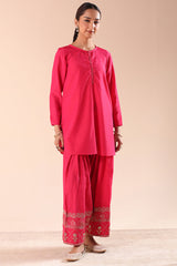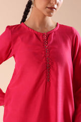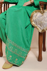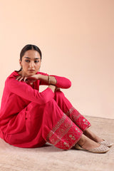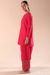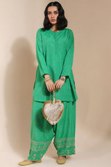 Handcrafted farshi shalwar featuring delicate detailing along the borders, paired with a classic-fit shirt with a round neckline and loop buttons along the front slit, finished with a round hem.