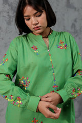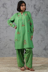 Hand-crafted classic-fit shirt featuring intricate patti work enhanced with aina detailing. Designed with a refined low band neckline and a subtle V-slit accentuated with mirror embellishment, finished with cuffed sleeve hems. Paired with a matching embroidered classic-fit shalwar.