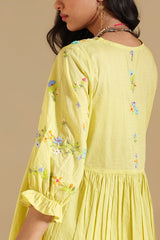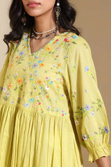 A hand-embroidered detailed flared shirt with a V-neckline, featuring gathered sleeves with a frill design and soft gathers on the bodice that enhance the flare. Paired with straight-fit trousers for an elegant, balanced look..