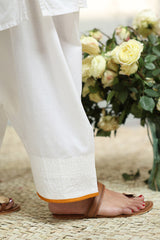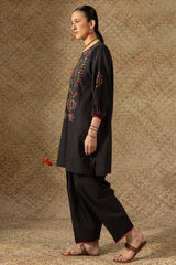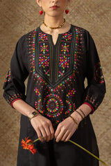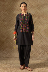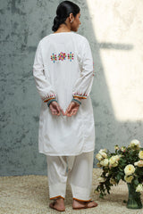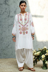 Hand-crafted paneled kurta adorned with vibrant tukri work, enhanced with intricate aina and thread detailing. Subtle cuffed sleeve hems add structure, while color-blocked edges create a striking contrast. Paired with a khula-poncha shalwar an artisanal look.