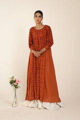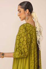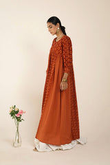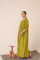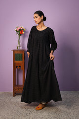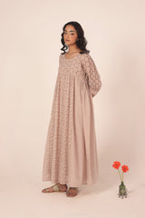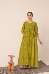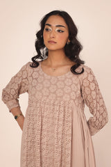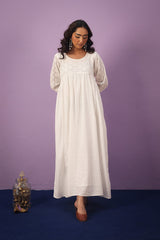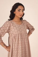An exclusive, custom-made Schiffli-patterned classic-fit frock featuring a round neckline. The gathered empire waist adds a comfortable, flowing flare to the silhouette, while the cuffed sleeves are enhanced with button detailing. Can be paired effortlessly with any Generation fits.