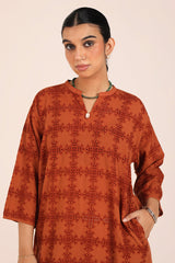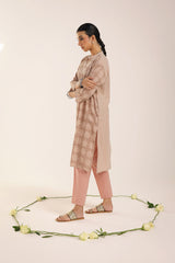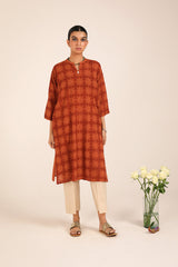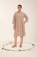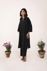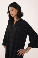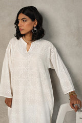 A classic-fit kurta featuring a custom-made Schiffli pattern enhanced with intricate embroidered detail, a band neckline with a V-slit, and delicate shell details for a refined touch. Can be paired with any generation bottoms for a complete look.