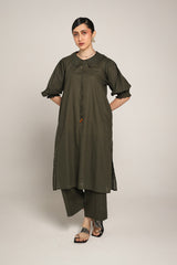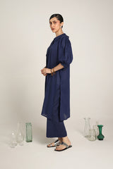 Embrace minimalist elegance with this solid-hued easy-fit kurta, featuring a round neckline with a pan collar style. The slit is enhanced with tassel details, while gathers around the sleeve hems add a touch of charm. Paired with matching classic culottes, this ensemble is a perfect blend of simplicity and contemporary style.
