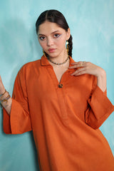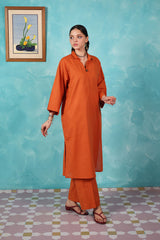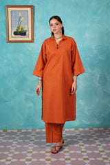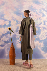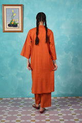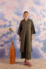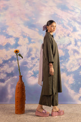 A loose fit kurta with drop shoulders featuring collared V neckline with button detailing at the front. Paired with matching solid culotte trousers.