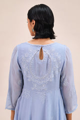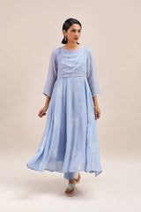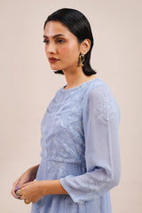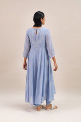 A panelled embroidered frock featuring a rounded neckline accented with delicate lace edging. The bodice features delicate floral embroidery while the soft flare adds a graceful charm. The back is adorned with a teardrop keyhole neckline with delicate embroidery motifs and lace accents.Sleeves adorned with lace detailing. Paired with a straight fit trouser, this ensemble exudes quiet elegance.