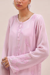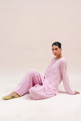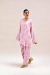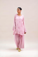 An embroidered paneled kurta with a round neckline and buttons enhanced with mukaish detailing along the front placket. An inner provides added comfort and ease. Paired with a traditional farshi shalwar for a timeless, elegant look.