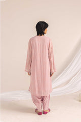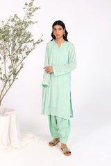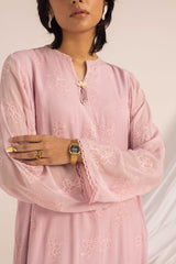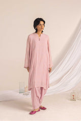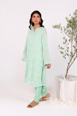 A floral embroidered straight-fit kurta featuring a round neckline with a V-slit, adorned with bead and phool tassel detailing. The neckline is enhanced with delicate beadwork, while the sleeve hems are finished with lace trim. Paired with a solid cowled shalwar for a graceful, effortless look.