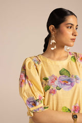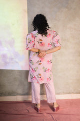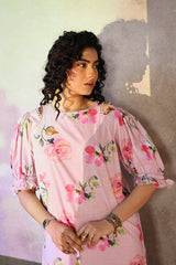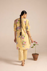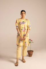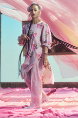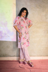A loose fit printed shirt with round neckline, featuring cut out detailing at the collar bones, along with crochet lace detailing on neckline and ruched elbow length sleeves. Paired with solid straight fit trousers with embroidery detailing at the hems.