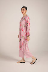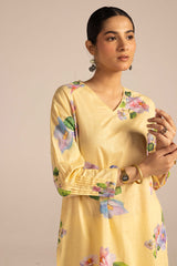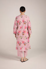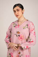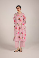 A classic-fit floral printed kurta featuring a V-neckline, elegantly adorned with delicate lace trim. The lace detailing extends to the shoulders, adding a soft charm, while gentle gathers on the sleeves enhance the silhouette. Paired with solid-hued culottes for a refined yet effortless look.