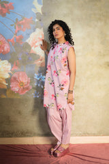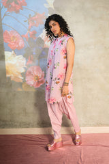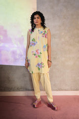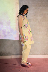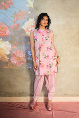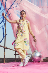 A sleeveless classic fit kurta is crafted with a watercolor floral print and features a band neckline. The placket is enhanced with stitching detail, while the shoulder edge is adorned with a delicate trim, adding a touch of refinement. Paired with solid-hued, classic pegged shalwar, this ensemble exudes effortless style.