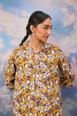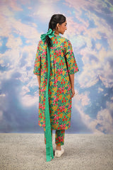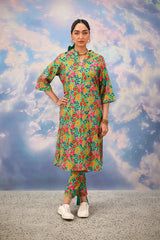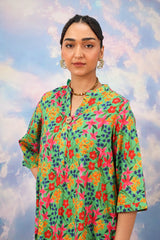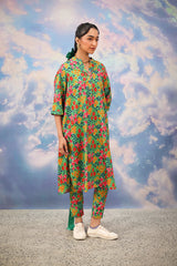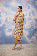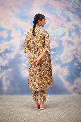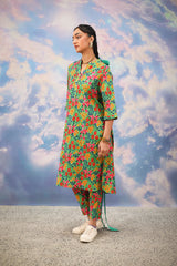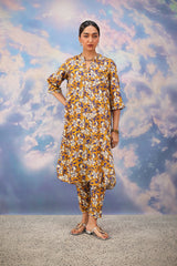 Crafted in a straight-fit silhouette, this floral printed kurta features a band neckline with a V-slit, adorned with rustic wooden buttons. Three-quarter sleeves and a rounded shirt hem add to its effortless charm. Paired with matching printed cigarette pants.