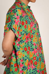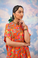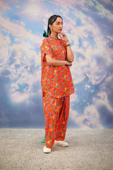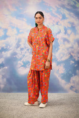 A classic-fit floral printed kurta features a band neckline, accentuated with popping color button details along the placket. The sleeve hems are subtly enhanced with delicate stitching, while the drop shoulder design adds a relaxed touch. The bodice is adored with pleats, complemented by a rounded shirt hem. Paired with a matching printed classic-fit shalwar for a complete look.