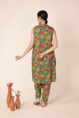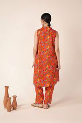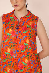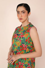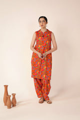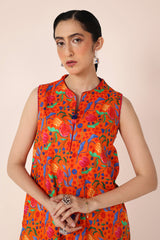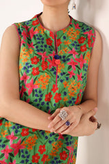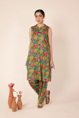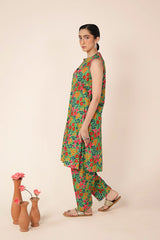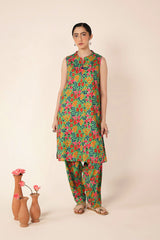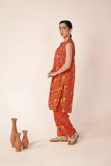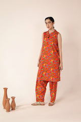 A classic, vibrant-hued floral printed kurta featuring a round neckline with a V-slit, adorned with dori piping and delicate floral tassels. The sleeve hems are finished with a subtle lace trim, adding an understated charm. Paired with a matching printed classic-fit shalwar, this ensemble exudes effortless elegance with a touch of playful florals.
