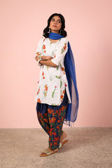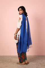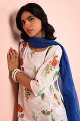 A classic-fit embroidered shirt featuring a round neckline, adorned with vibrant floral embroidery for a lively touch. Paired with classic fit shalwar, highlighted with vibrant Gulbaag embroidered detailing, creating a balance of tradition and elegance.