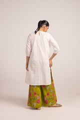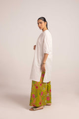 A classic-fit self-embroidered kurta with a round neckline, featuring delicate gathers around the neckline. The cinched sleeve hems are adorned with vibrant lace details, and the side slits showcase intricate stitch detailing. Paired with Rang Bahar printed culottes, this set combines style with elegance.