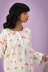 A classic straight-fit paneled kurta, adorned with vibrant Gul Bahar embroidered motifs. The round neckline and placket feature colorful lace detailing with delicate buttons, while the sleeve hems are trimmed with intricate lace. A fusion of elegance and charm. Paired with a contrast embroidered shalwar for a refined look.