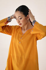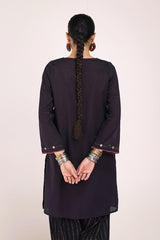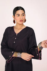 A classic-fit solid-hued kurta features a V-neckline adorned with intricate thread detailing along the neckline and slit. The slit is further embellished with metallic accents, while the sleeve hems are enhanced with delicate stitches and embellishments. This versatile piece pairs effortlessly with any Gen fits.