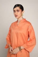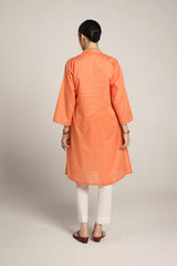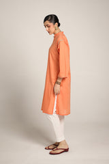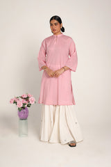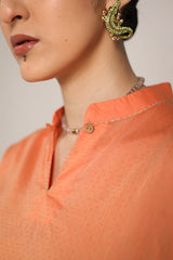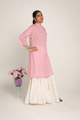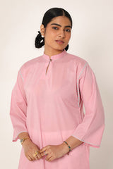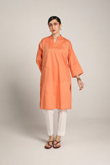 A classic-fit, solid-hued kurta featuring a dotted texture, band neckline with a V-slit, and delicate stitch and button detailing. The sleeve hems and shoulders are adorned with intricate embroidery, adding a refined touch. Can be paired effortlessly with any Gen fits.