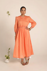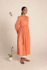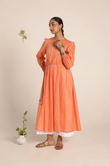 A classic-fit long flared kurta in a solid hue, featuring a round neckline adorned with delicate buttons on the front placket. Intricate stitching details enhance the neckline, while soft gathers around the empire waist create a naturally flowing silhouette. The cinched sleeves, along with refined stitching details on the sleeve hems, complete the elegant look. Can be paired with any Generation fits for a versatile ensemble.