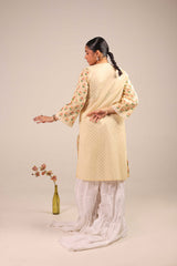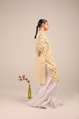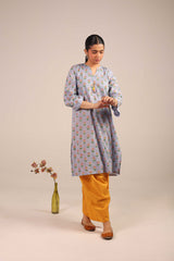 A classic-fit block-printed kurta featuring a round neckline with a V-cut and colorful tassel detail on the placket. Pastel-hued block-printed motifs and embroidered sleeve hems add charm. Pairs effortlessly with Generation fits for a sophisticated, timeless appeal.